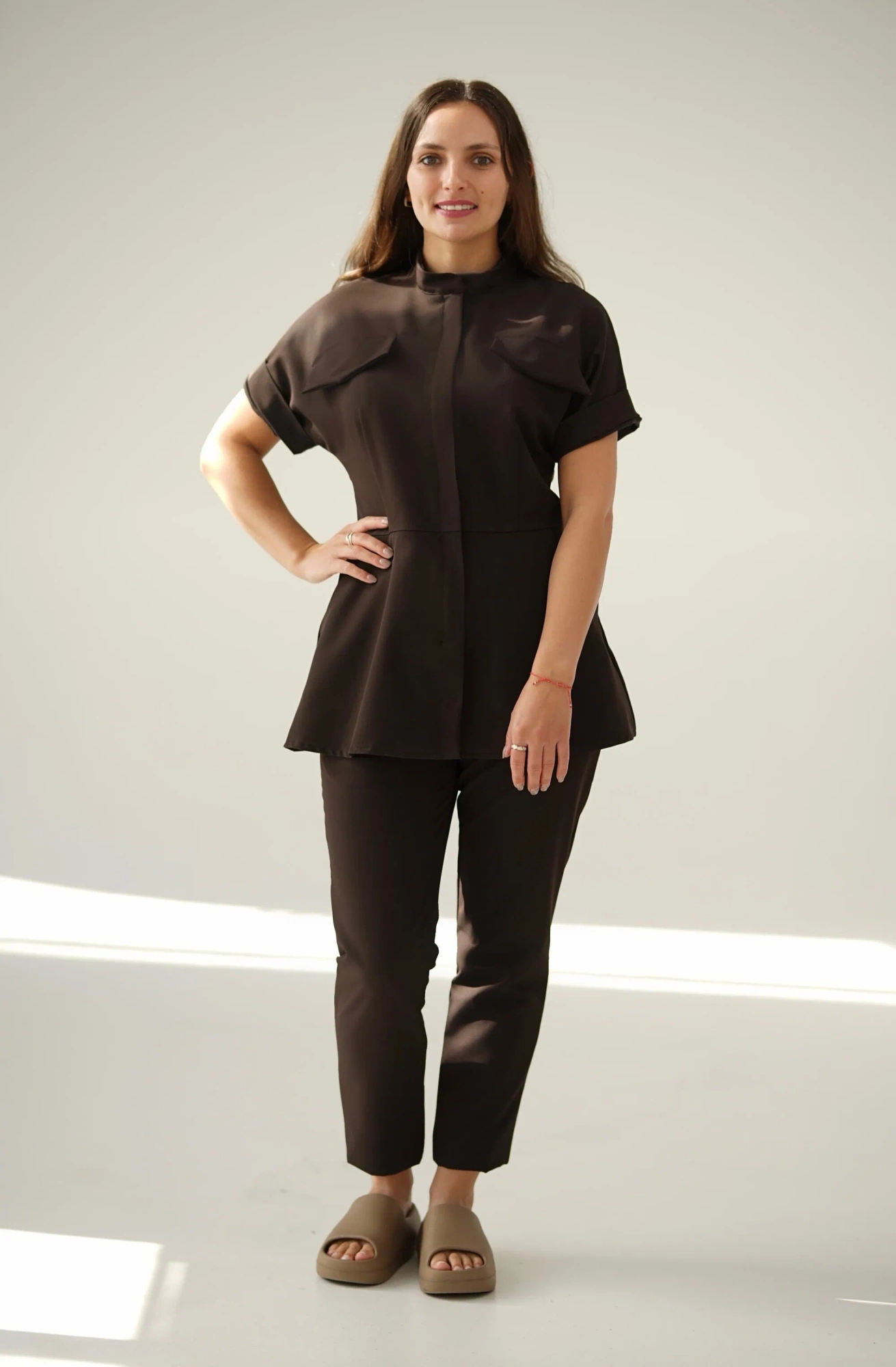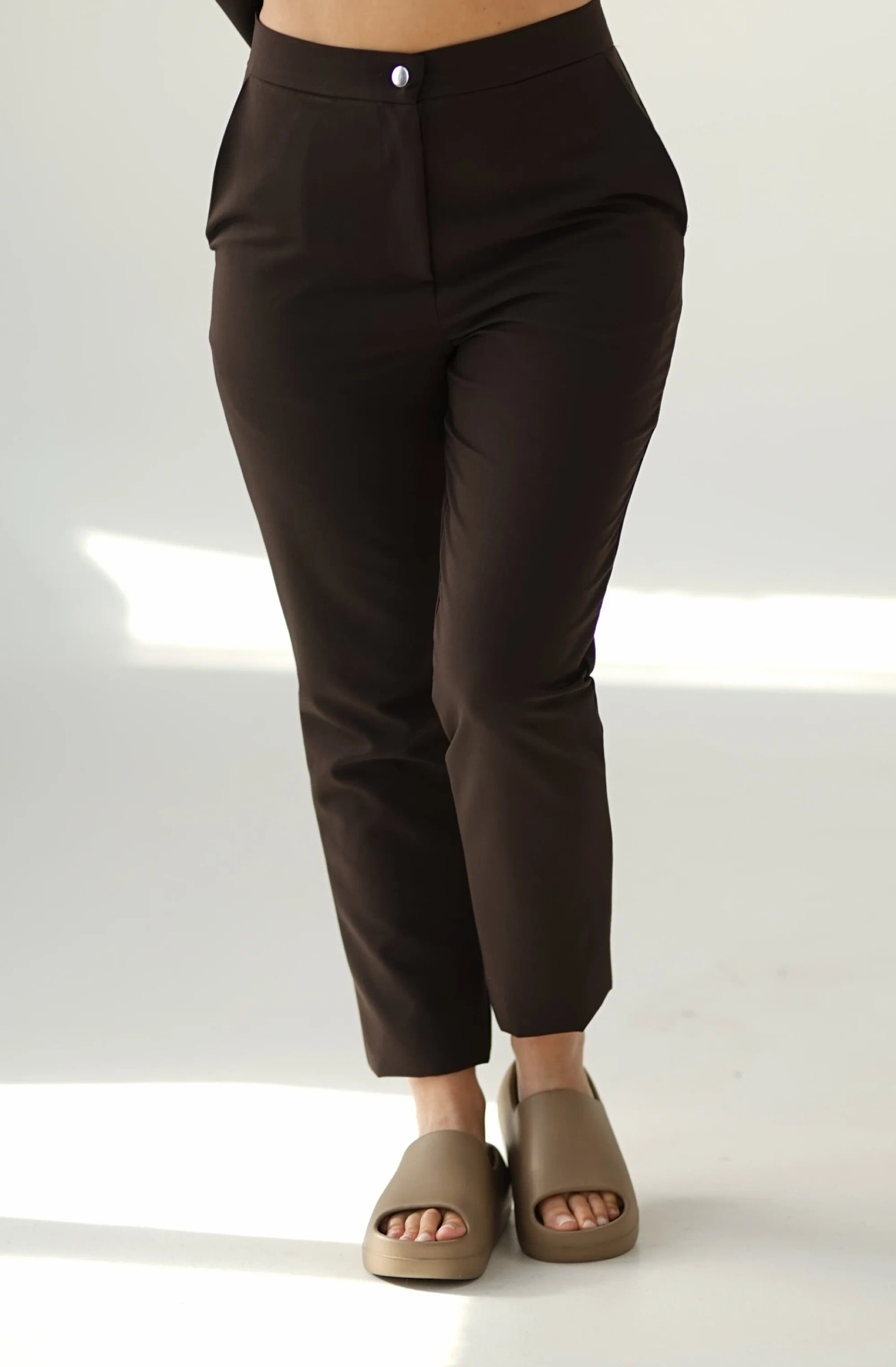 Spodnie cygaretki w kolorze CZEKOLADOWYM świetnie komponują się z naszymi topami i bluzkami z tej samej kolekcji, tworząc spójny, kapsułowy uniform idealny do pracy w branży beauty, wellness, medycynie estetycznej czy fizjoterapii.