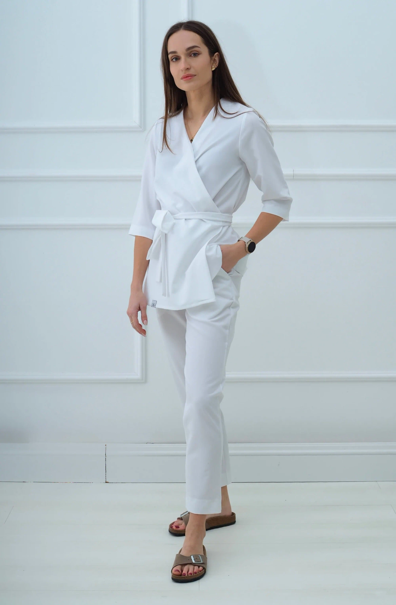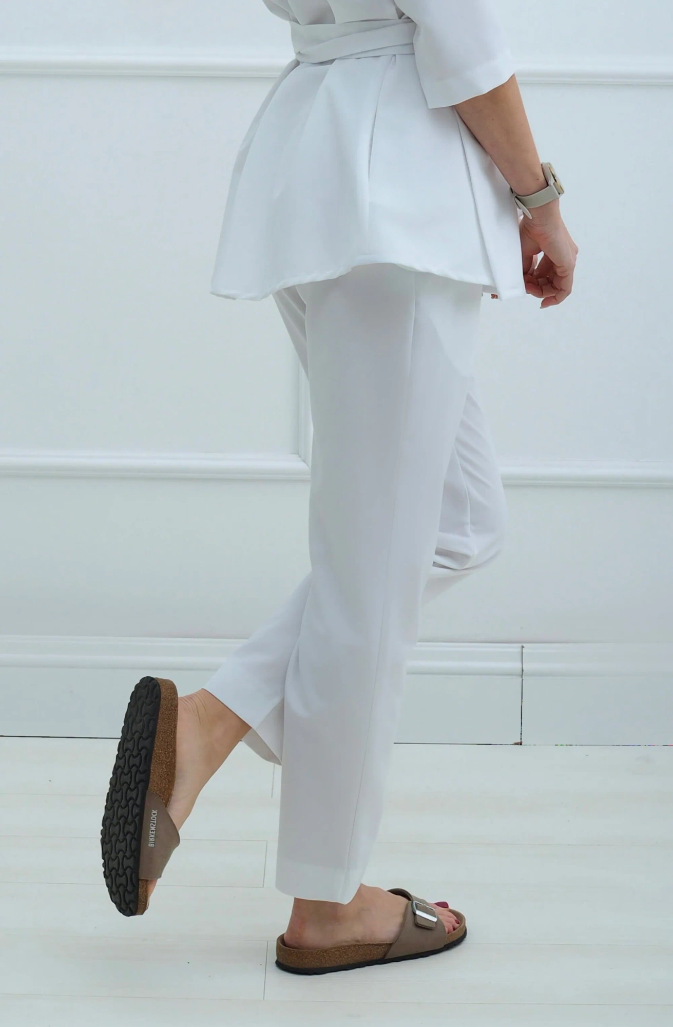 Spodnie cygaretki WHITE świetnie komponują się z naszymi topami i bluzkami z tej samej kolekcji, tworząc spójny, kapsułowy uniform idealny do pracy w branży beauty, wellness, medycynie estetycznej czy fizjoterapii.