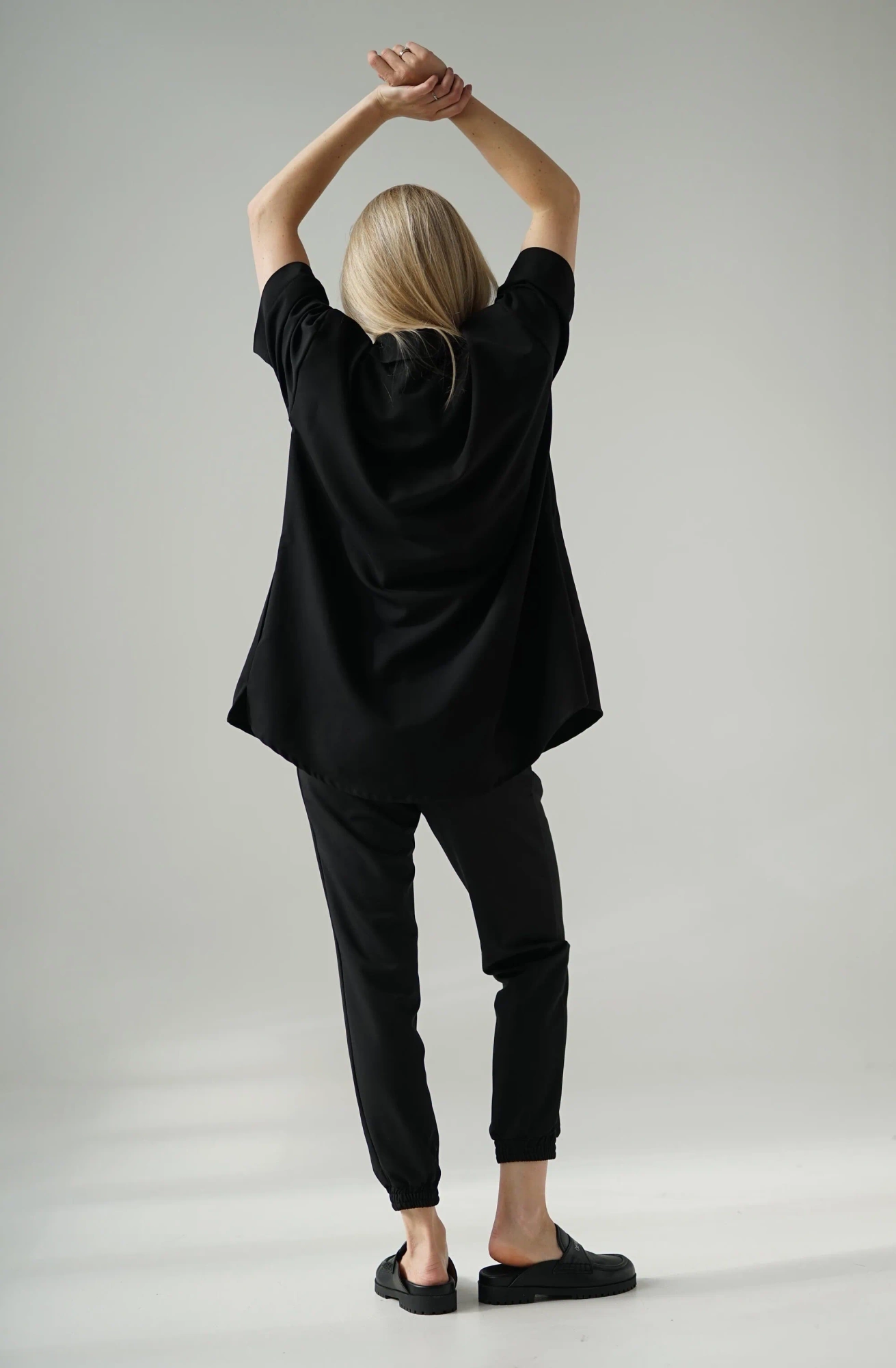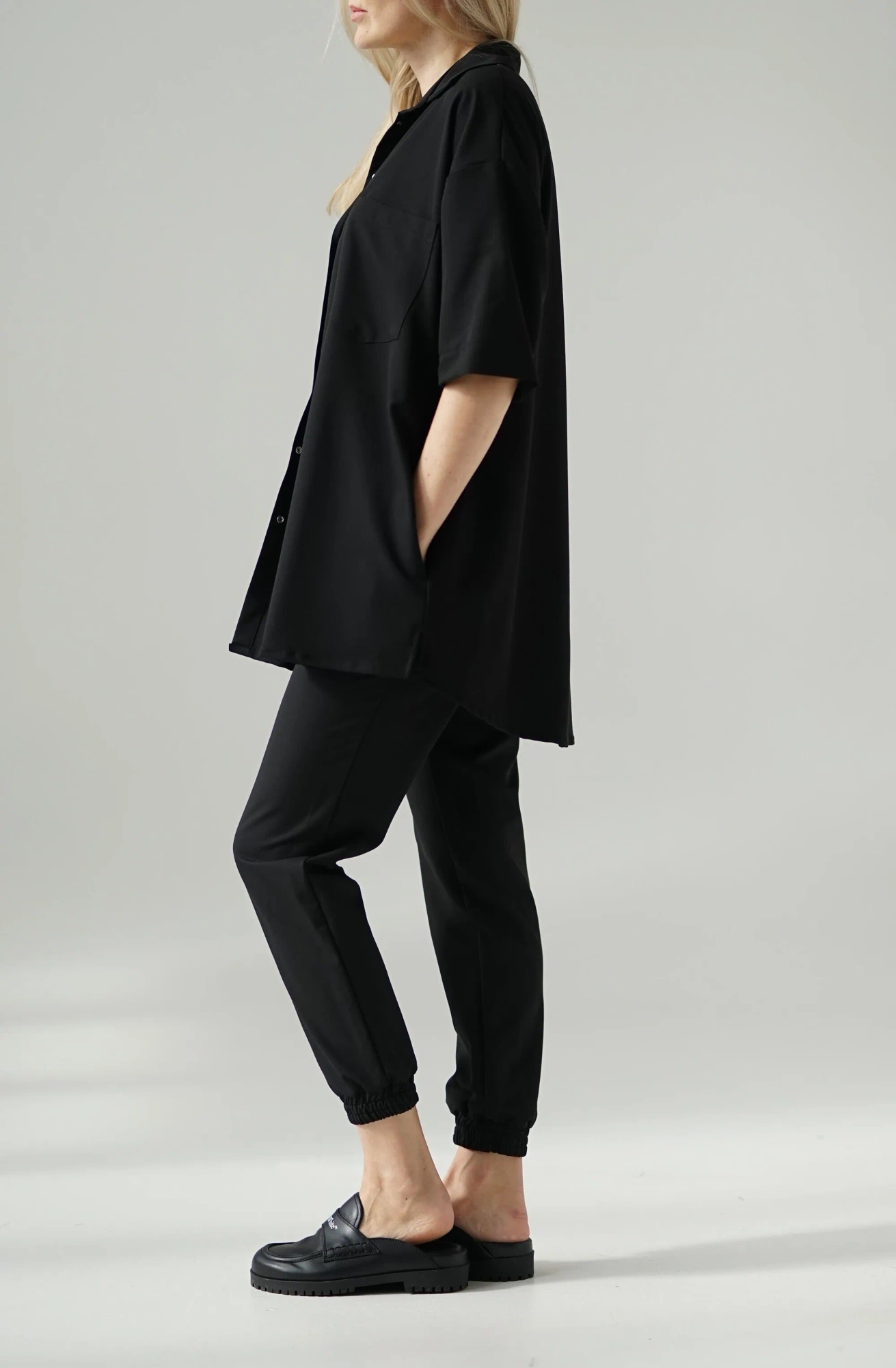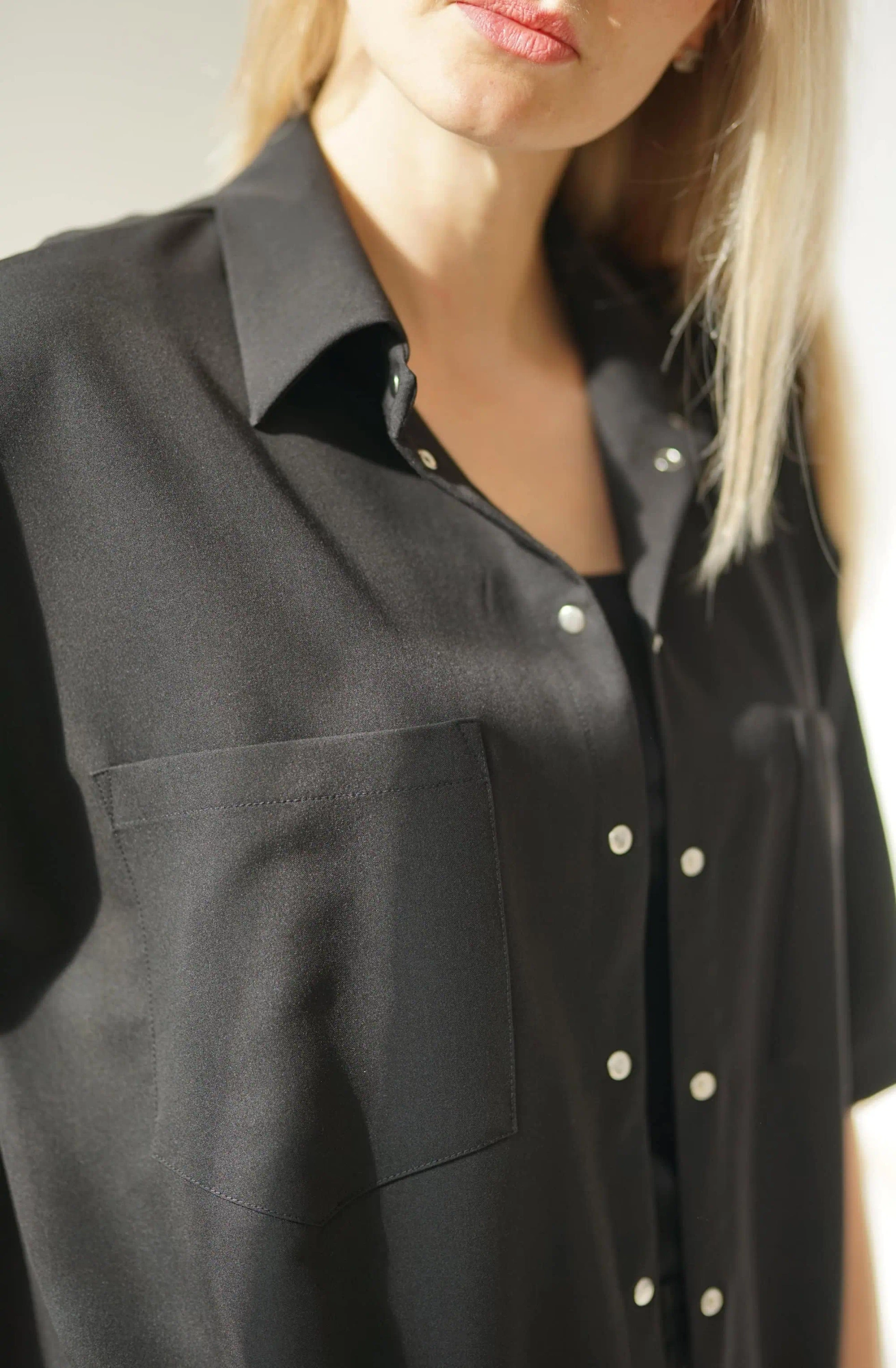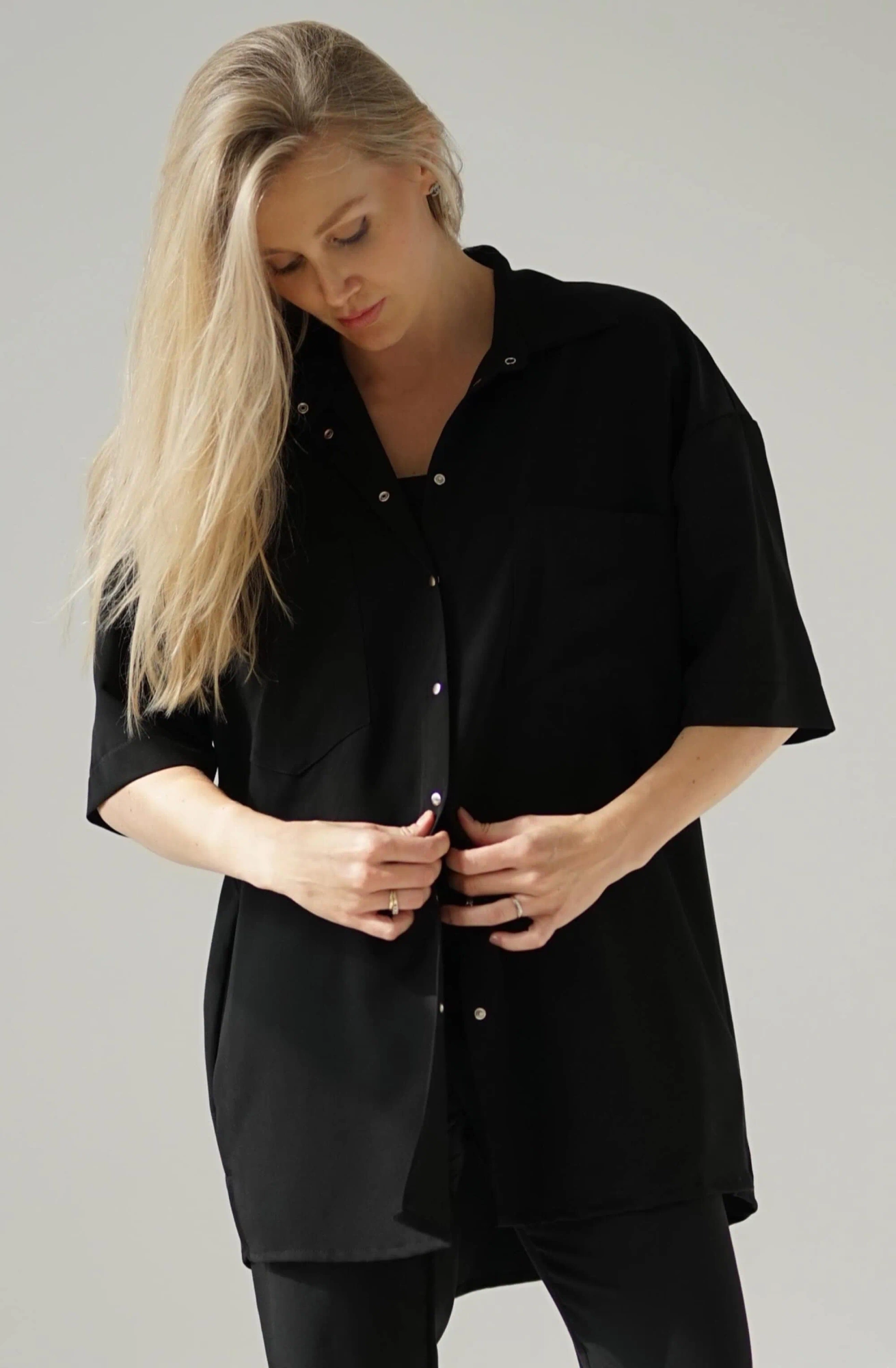 Koszula oversize BLACK w połączeniu z naszymi joggerami BLACK lub dzwonami BLACK wykonanymi z tego samego materiału, będzie wyglądać zjawiskowo. Dopasuj spodnie w czarnym kolorze bądź wybierz ten, który lubisz z naszego asortymentu.