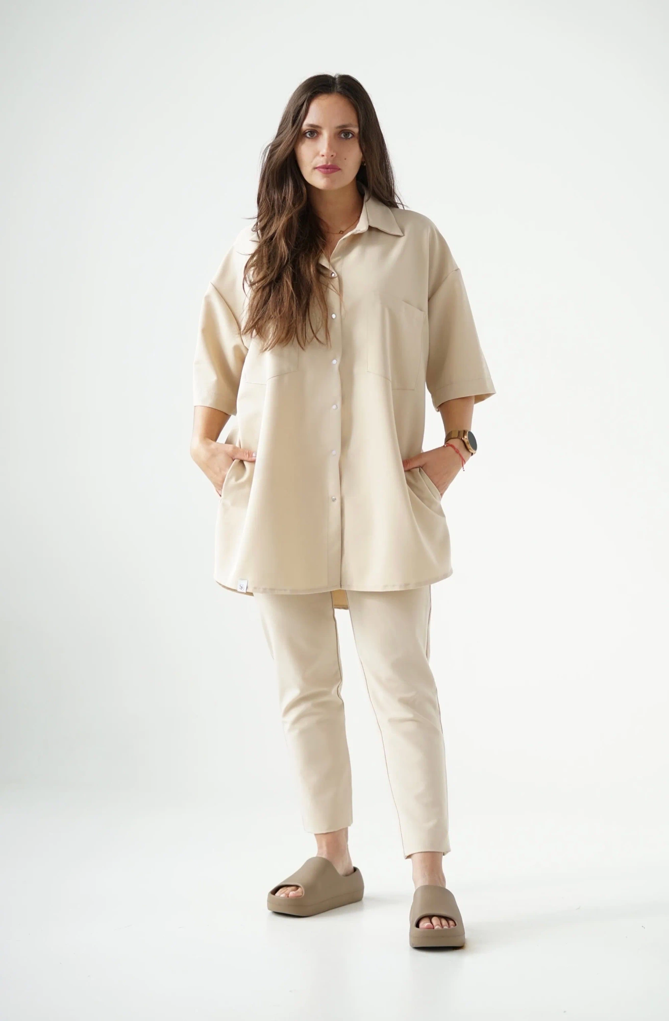 Koszula oversize IVORY w połączeniu z naszymi spodniami, będzie wyglądać zjawiskowo. Dopasuj spodnie w tym samym kolorze bądź wybierz ten, który lubisz z naszego asortymentu.