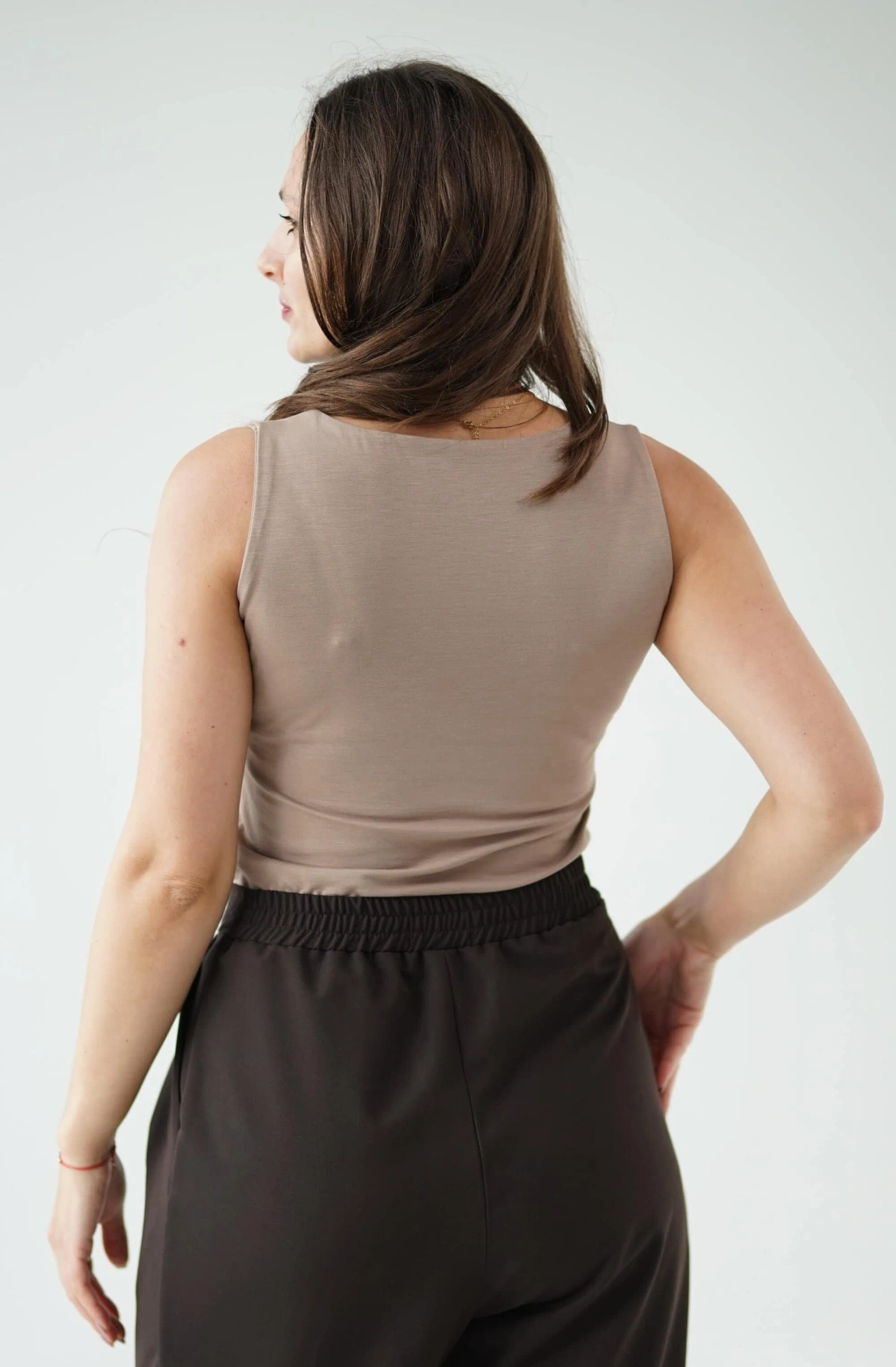 Czarny top na grubych ramiączkach S’OVERALL to połączenie minimalistycznego designu, komfortu noszenia i perfekcyjnego kroju, który podkreśla sylwetkę, nie ograniczając swobody ruchów.