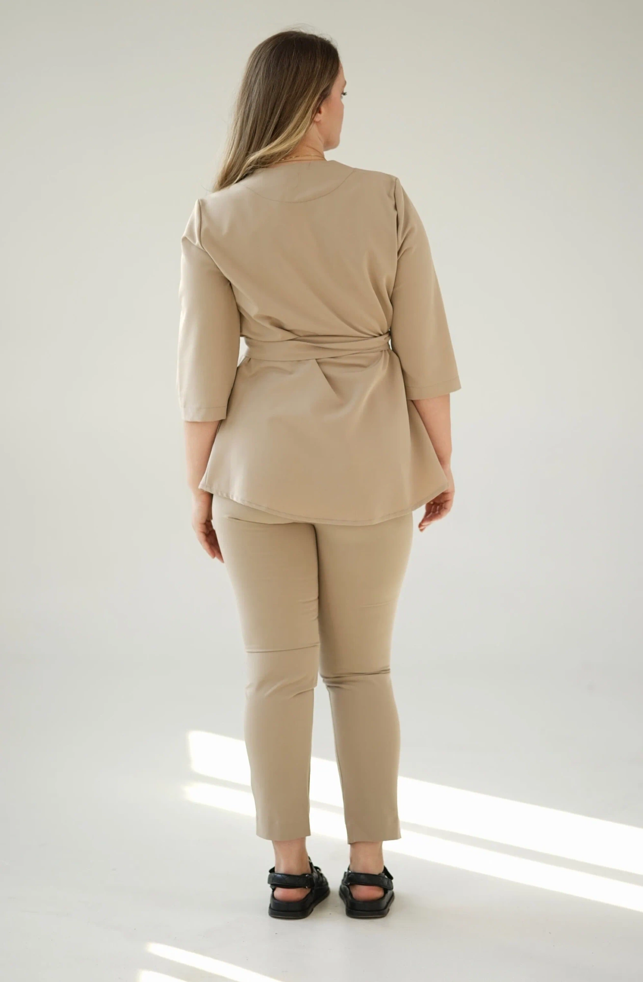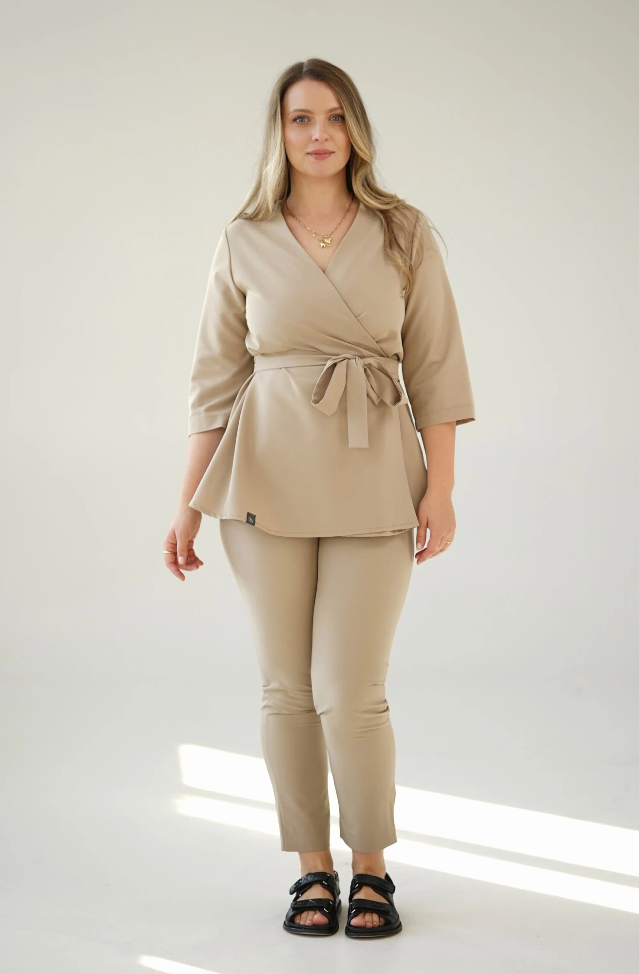 Tunika kopertowa SAND w połączeniu z naszymi dzwonami SAND lub cygaretkami SAND, wykonanymi z tego samego materiału, będzie wyglądać zjawiskowo. Dopasuj spodnie w kolorze SAND bądź wybierz ten, który lubisz z naszego asortymentu.