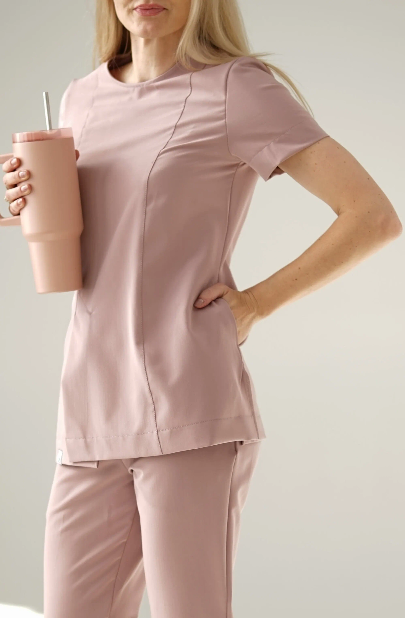 Ta elegancka tunika z rozcięciem na przodzie to idealne rozwiązanie dla wszystkich profesjonalistów w branży medycznej i beauty, którzy pragną wyglądać modnie, jednocześnie nie rezygnując z wygody podczas pracy.