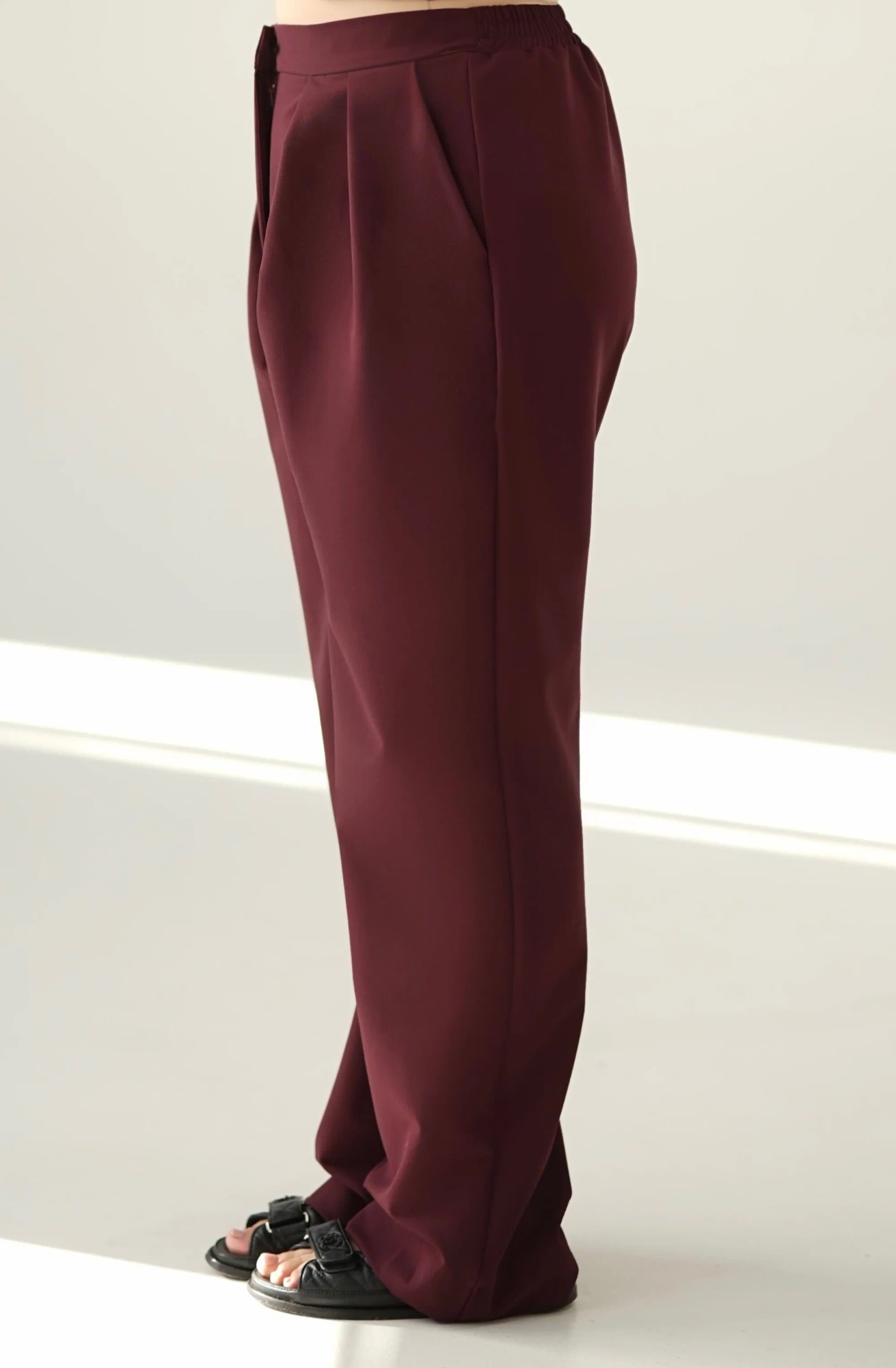 Nasze Spodnie wide leg w kolorze burgundowym posiadają dwie wpuszczane kieszenie na najpotrzebniejsze drobiazgi. Wydłużony krój i szeroka nogawka nadają im niepowtarzalnego stylu.